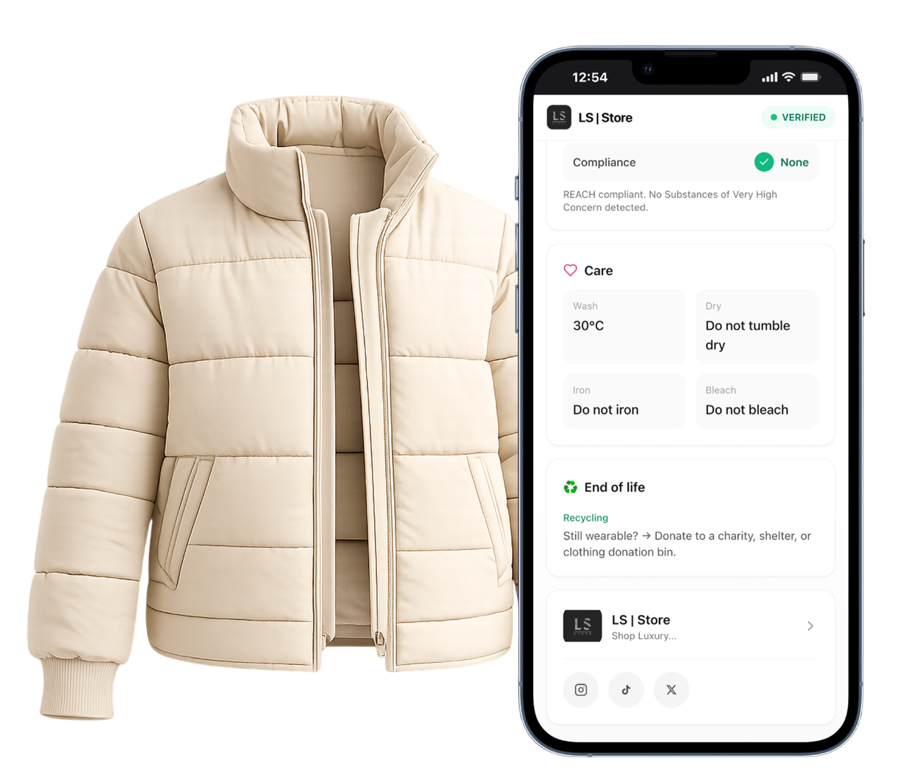 GOTS, OEKO-TEX®, GRS, FSC, REACH e oltre 10 standard globali sono già integrati. Collega le tue certificazioni al prodotto fisico e rendile consultabili da chiunque scansioni il tag — trasformando la sostenibilità da narrazione a dato verificabile.
